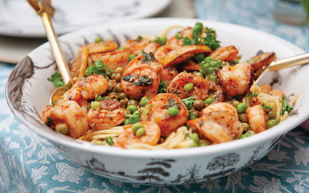 Celebrate the season with two lemony shrimp-centric menus, fresh salads, and indulgent desserts—all served on a beautifully simple outdoor table