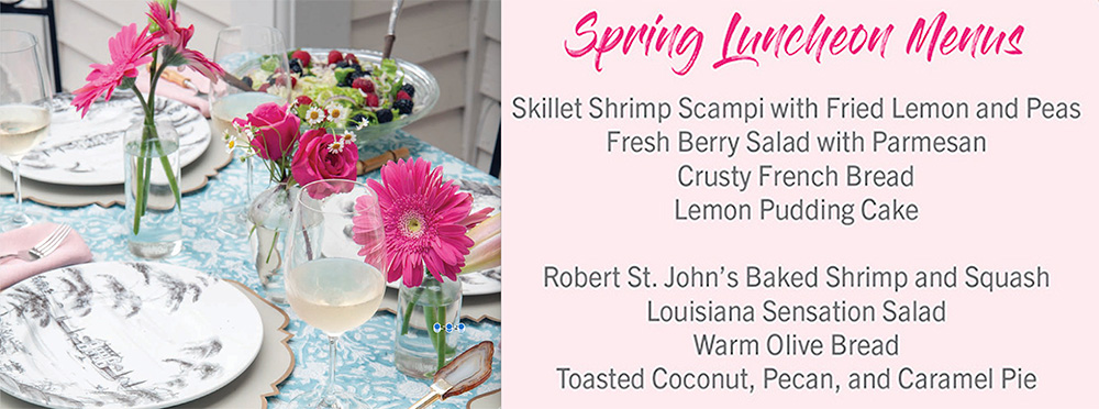 Spring has arrived, and along with it, a multitude of occasions to host a beautiful outdoor luncheon. From bridal brunches to Easter lunches to birthday celebrations, try these seasonal menus featuring delicious shrimp dishes, simple salads, and two incredible desserts. Make it even more special by setting a lovely table outside on your patio or deck. We kept it simple with a pastel palette in our tablecloth, china, vintage linen napkins, and effortless florals with a pop of pink!