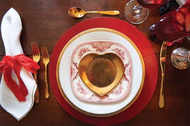 Set a romantic Valentine’s table with bold red layers, starting with a modern textured red placemat, gleaming gold accents, and a charming heart-shaped dish at the center. A ribbon-tied napkin and ruby-hued drinks complete the warm, fireside-ready setting—perfect for an intimate dinner for two. Placemat and gold heart dish, sourced at Rosson Co., in Cleveland.