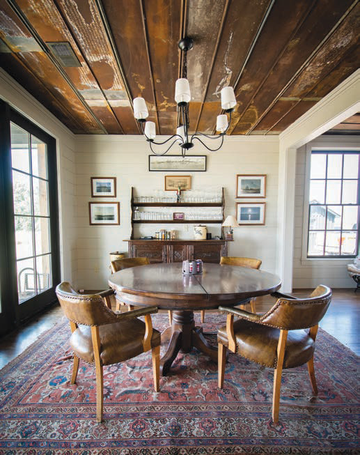 The den adjoins a card room with a heavy, expandable game table flanked with leather captain’s chairs on top of an antique oriental rug. Hunt is known to use unconventional materials to enhance the overall character of his projects, such as the salvaged rusty tin used for ceiling material in the card room and other newly redesigned rooms, which are capped, adding a unique and handsome element to the overall aesthetic.