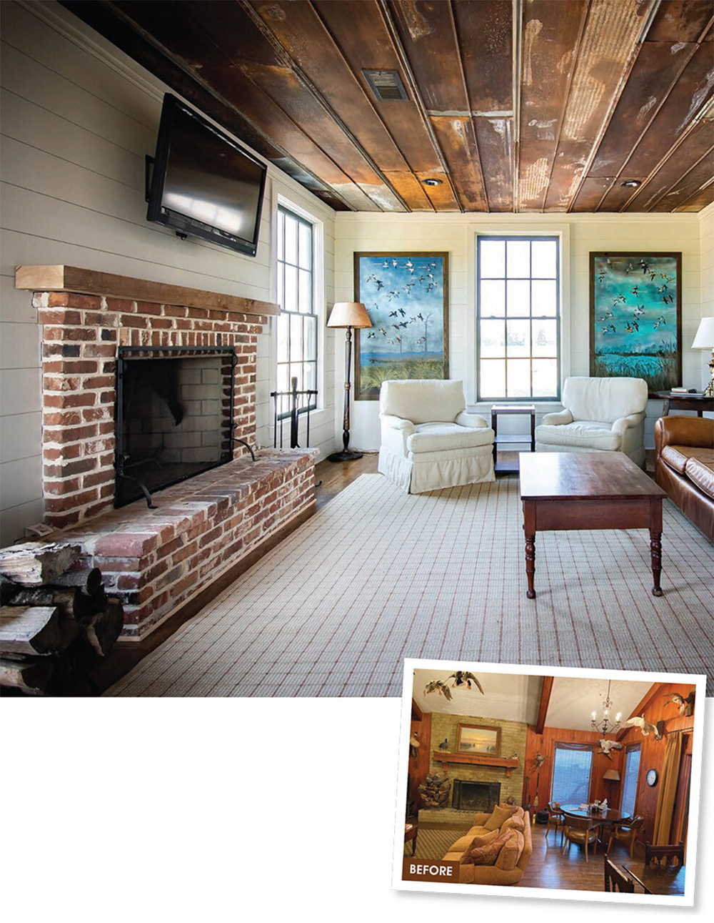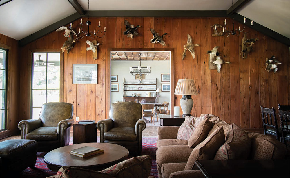 “We wanted to make sure that the interior was inviting enough to enjoy, especially if the hunting wasn’t so great,” says one of the longtime members. The existing great room was kept in the plans because its layout still worked for large entertainment gatherings. “They loved the old pecky cypress paneling and the beams and fireplace,” Hunt says.