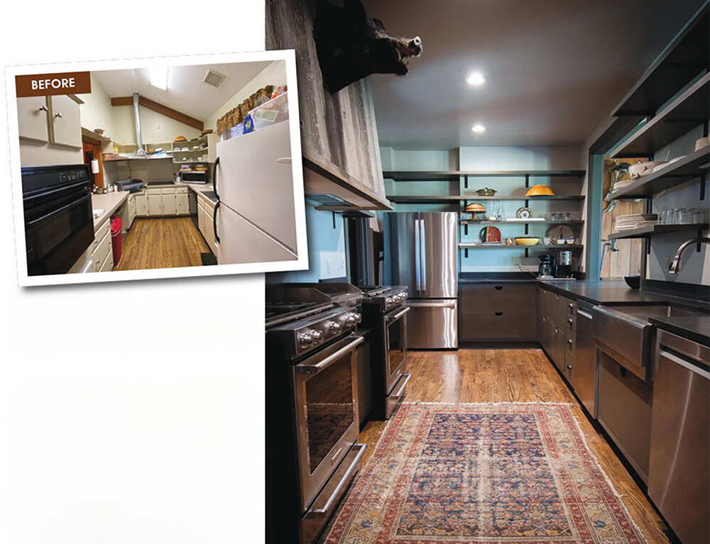 The modern galley kitchen is a hard-working space, complete with two ranges and two dishwashers, creating an updated, more functional kitchen. The stainless appliances are juxtaposed with rustic touches such as the decorative rough wood, which encapsulates the ventilation system. Open shelving replaced the upper cabinetry, allowing for a more open feel. Black, leathered-finish granite countertops are not only durable but also work well with the character of the entire house. Oriental rugs cover the handsome rustic flooring. And fittingly, a mounted boar’s head provides a creative focal point perched above the vent hood, welcoming cooks and guests alike.