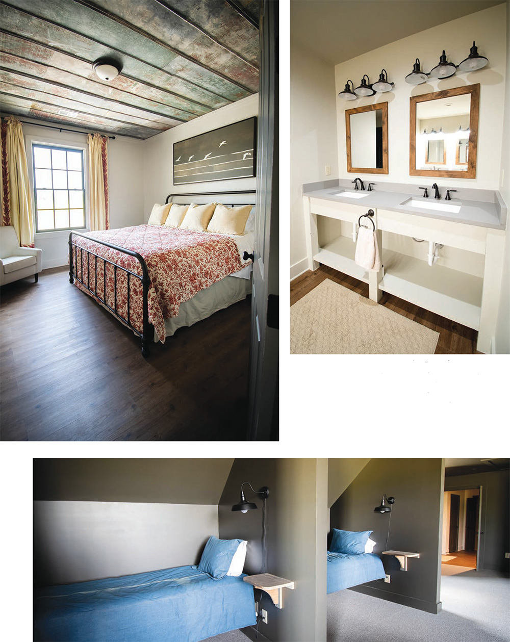 “In most of my projects, both clubs and private houses, the clients ask for functional mudrooms and large gathering spaces,” Hunt explained. “When I first started designing these hunting houses, closets and bedrooms were not a big issue, but now plenty of bedrooms and baths are a must.” The new bunk room at Blackfish is cleverly designed with built-in bed frames topped with twin mattresses, raised to give guests a place to store overnight bags and other items underneath. Instead of a night table, a small shelf was installed, with a wall lamp mounted above to save space. In addition to the bunk space, each member has his own bedroom and bath.