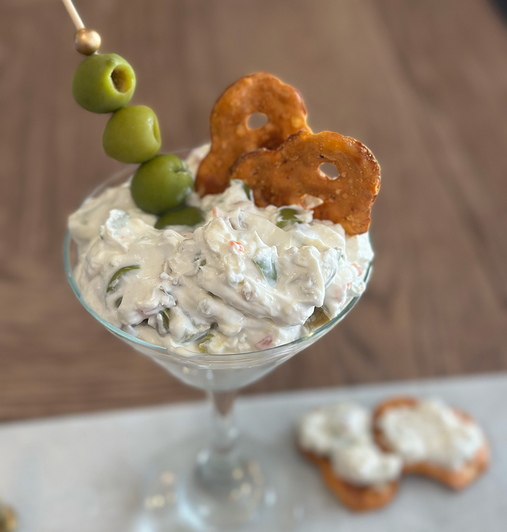 This recipe brings together all the classic cocktail elements in a dip that blends the flavors of blue cheese and olives. Perfect with dipping pretzels, crackers, or your favorite dippers!